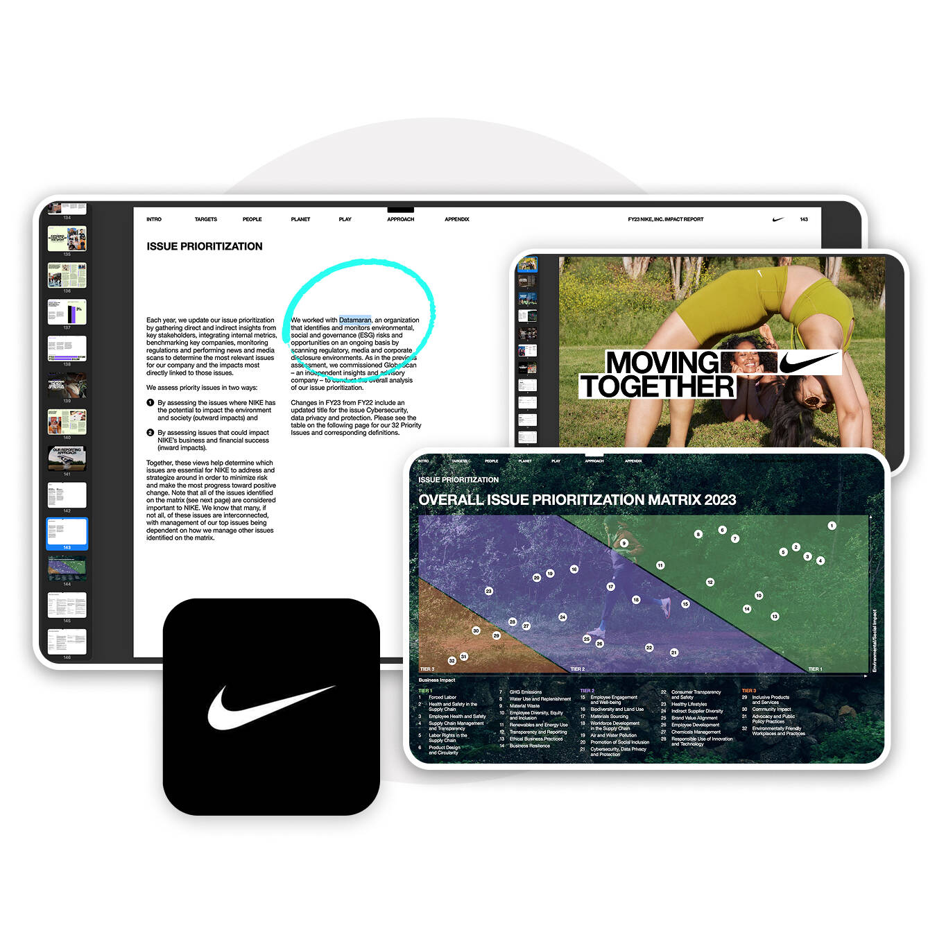 NIKE’s Impact Report ’23, mentioning Datamaran, and illustrating matrix chart.
