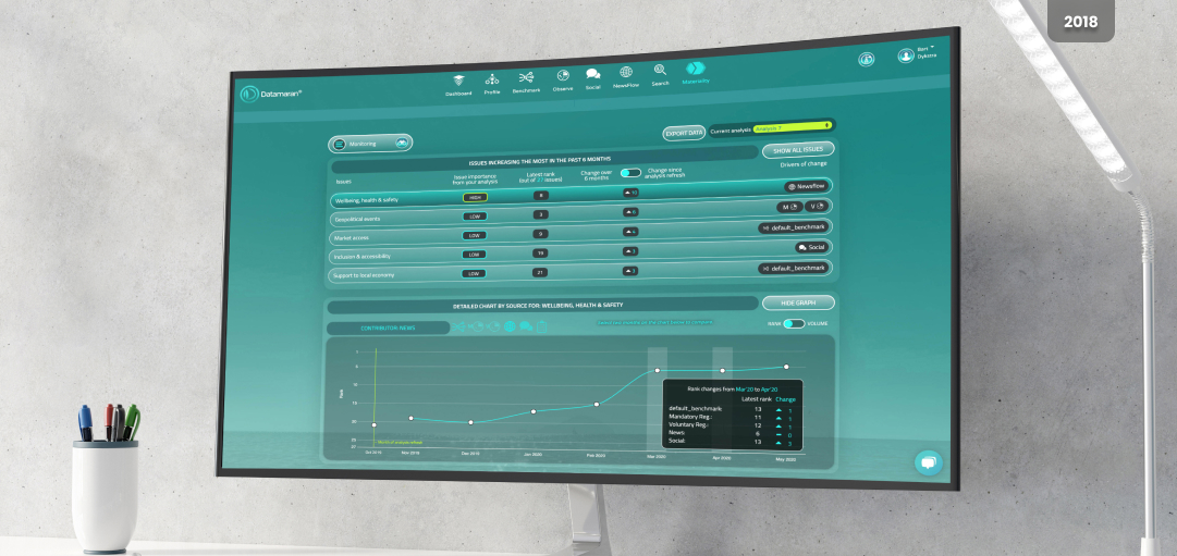 Datamaran’s platform helps organisations monitor risks and opportunities across regulatory landscapes, benchmark data, stakeholder expectations, and emerging trends at scale. Clients use it to scan legislation, standards, and market signals, then translate that noise into structured priorities and strategic actions. From a UX perspective, my role was to make this complexity feel manageable, designing dashboards, filters, and workflows that let risk, compliance, and sustainability teams see what matters, when it matters, and why it matters. By framing the platform as a continuous decision environment rather than a one‑off reporting tool, we enabled clients to treat ESG not as a side function, but as an integral part of strategy and governance. This required not only technical understanding, but also deep collaboration with client‑facing teams, consulting units, and customer success, to ensure that product decisions were grounded in real‑world client‑centric issues.