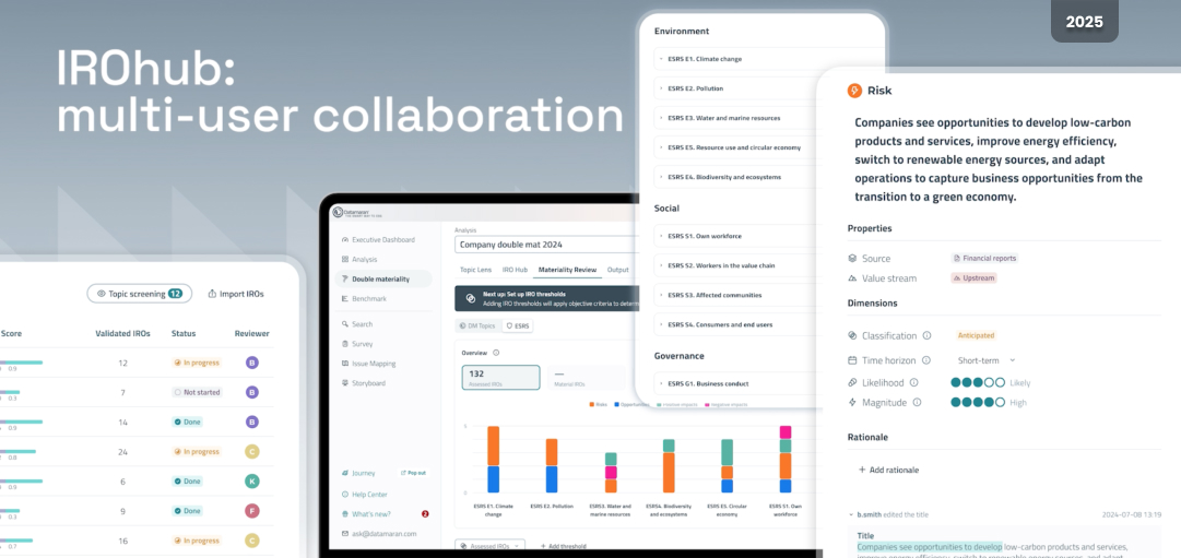 I led product UX design across five generations of the Datamaran ESG platform, evolving from old‑school wireframing to AI‑vibe‑coded prototypes, while growing a multidisciplinary design team and collaborating with product, engineering, and client‑facing units to solve real‑world ESG challenges. Through in‑person user forums, iterative agile development, and direct client involvement, I helped turn complex data into intuitive interfaces and the first online materiality assessment, which companies like Nike, Amazon, Decathlon, and Philips embedded into their Annual Financial Reports, showing how UX can move from the screen into the core of corporate strategy and reporting.